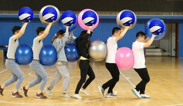 2、比赛方法与规则:比赛开始前,6名参赛队员前胸用瑜伽球顶着前方队员后背,双手捧气排球举过头顶准备好;裁判员发令后,队伍开始向前行进,到达交换点后由下一组队员向终点前进,以队伍整体越过终点线时为计时结束,用时少者名次列前。比赛全过程,队员双手捧气排球都必须举过头顶,违者加时10秒;比赛过程中,瑜伽球掉落一个加5秒,以此类推。队伍在行进过程中,6名队员都需用身体前后贴着瑜伽球行进,手臂手腕不允许夹瑜伽球,严重违规者,取消该队成绩。