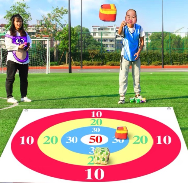 1.比赛方法:投球距离为4米,人数:不限,每人手上5个沙包,将沙包投入方形靶盘内。
